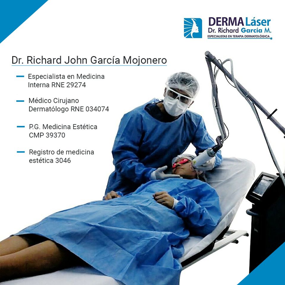 Médico Cirujano Dermatólogo Tricólogo Especialista en Transplante Capilar y Medicina Interna con Post grado en Medicina Estética Láser; Master en Tricología y Microinjerto Capilar: Richard John García Mojonero CMP: 39370, con RNE: 029274, RNE: 034074, REG: 3046, Egresado de la Universidad Nacional Mayor de San Marcos, con 20 años de experiencia en el área de la salud, específicamente en la rama de la Dermatología, Actualmente soy representante Legal y Gerente General de DERMALASER ESTETIC EIRL. Desarrollándome profesionalmente como Médico Jefe en Dermatología Láser en la Clínica San Juan Bautista en San Juan de Lurigancho, pues allí es la sede de la clínica DERMALASER ESTETIC EIRL. De igual forma es relevante destacar que soy miembro del Circulo Dermatológico del Perú, Ganador del Premio Internacional Sarah Faith 2006 por haber realizado esfuerzos extraordinarios en favor de la reducción de la mortalidad materna y perinatal, HEROES ANONIMOS en LIMA, Miembro de la Sociedad Peruana de Dermatología.